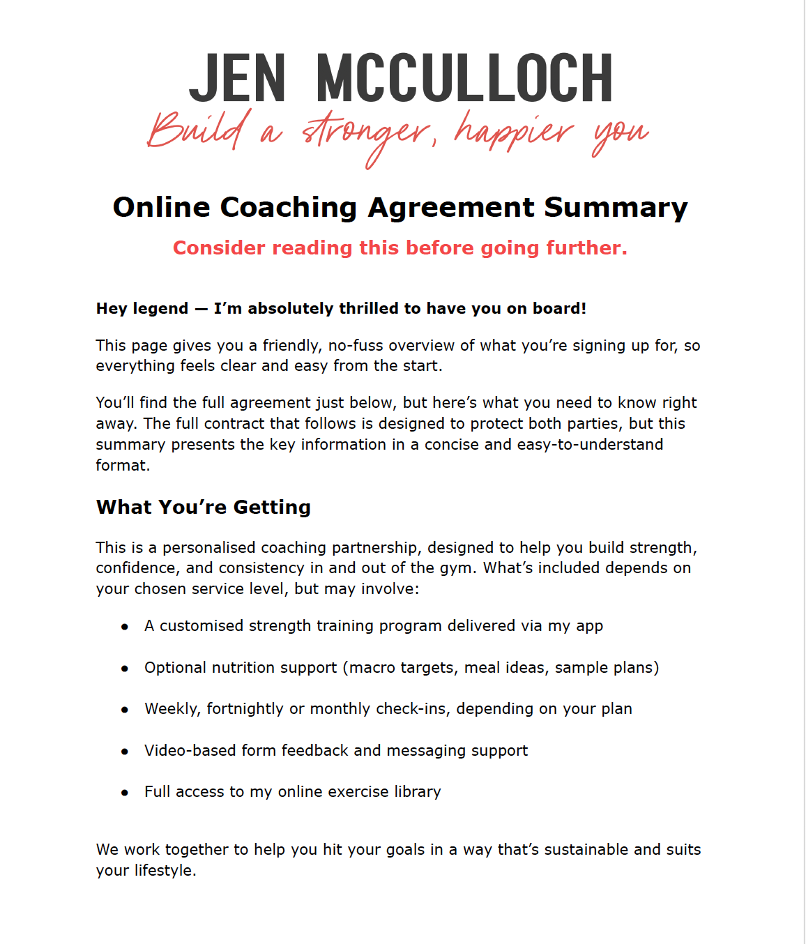 To become a client of Jen McCulloch, you will need to read and agree to our Client Agreement. This agreement includes an Informed Consent Form as well. Before starting any training program with us, you are required to read and sign the Informed Consent Form. This form explains the details of the program and any potential benefits or risks that may be associated with it.